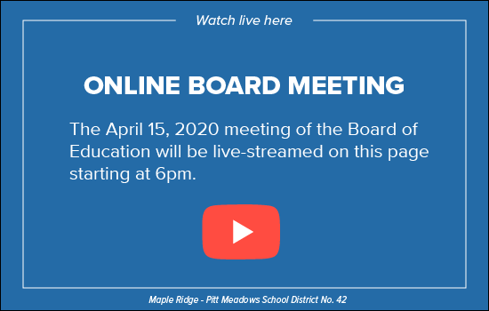 Due to COVID-19, all Maple Ridge – Pitt Meadows Board of Education meetings will be conducted online until further notice. Meetings will be live-streamed through the SD42 YouTube channel; the live stream will also be embedded at https://www.sd42.ca/online-board-meetings/