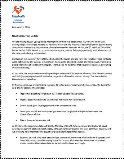 The following novel coronavirus (COVID-19) update has been provided by Fraser Health:
