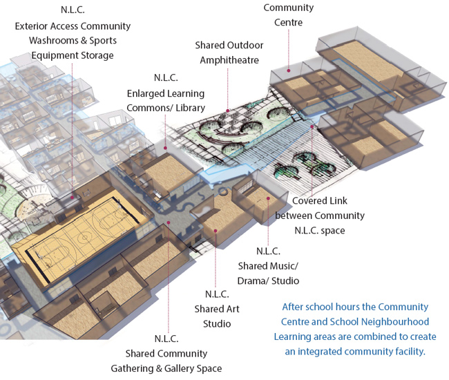 A Neighbourhood Learning Centre is funded by the Ministry of Education and Child Care, is physically integrated within the school, and offers services complementary to the educational programming within the school.
