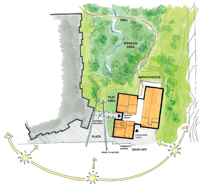 Below are a site plan, a floor plan, and concept renderings for the potential elementary school.