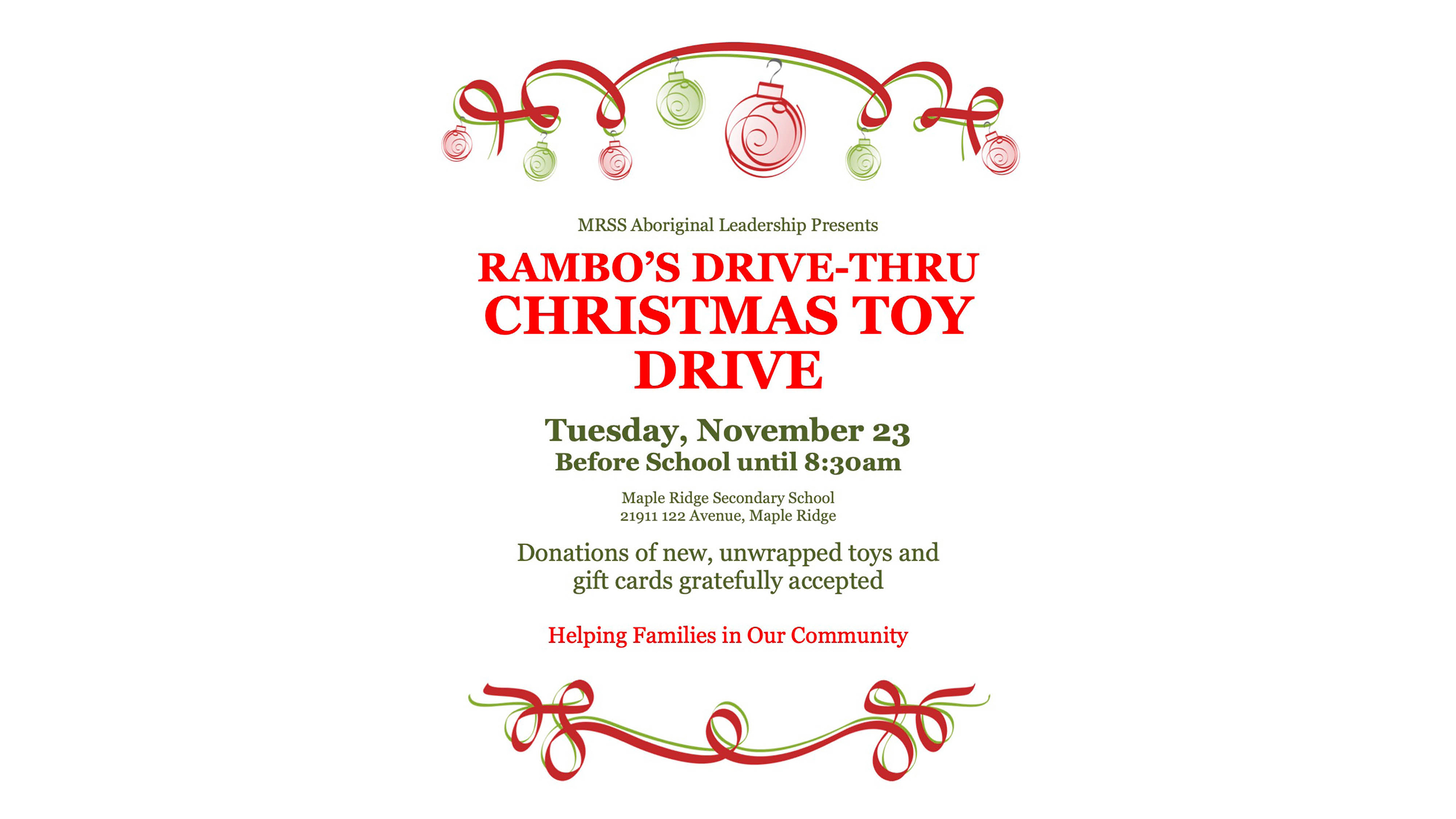 Maple Ridge Secondary’s Aboriginal Leadership Team will be accepting donations of new, unwrapped toys and gift cards during the annual Rambo’s Drive-Thru Christmas Toy Drive on Tuesday (Nov. 23).