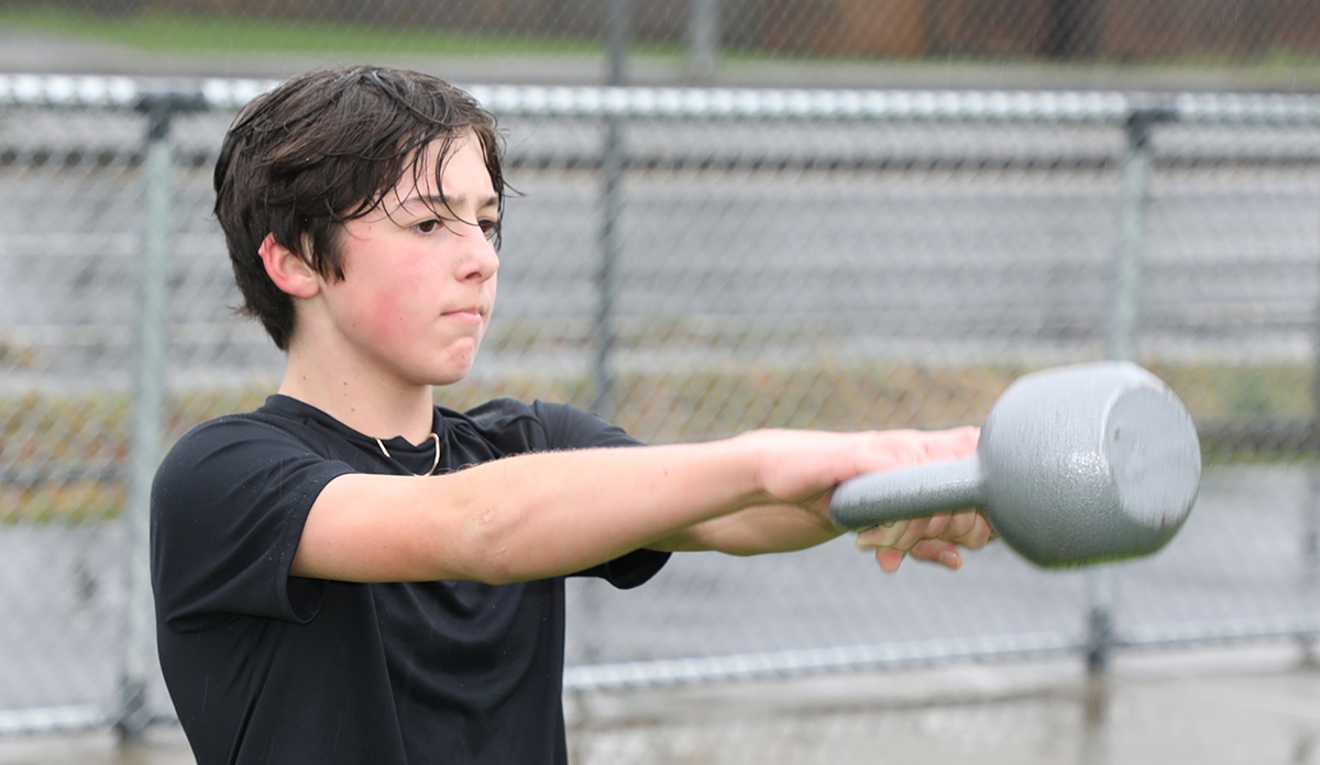 Grade 8 student Alexander Weeks does a kettlebell swing during a Peak Performance workout at Thomas Haney Secondary.