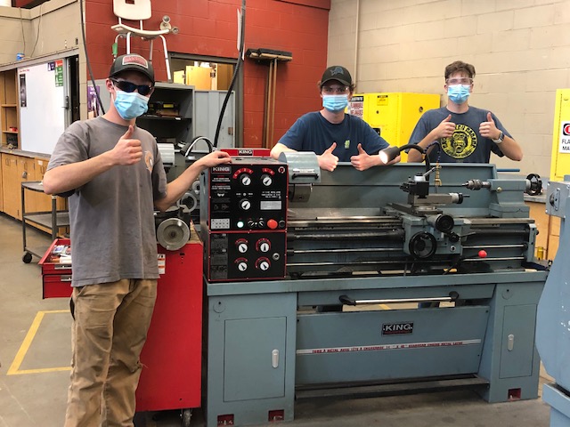 Left to right: SRT students Caleb Orieux, Billy Williamson, and Ryan Bauer stand next to the metal lathe donated by Lordco Auto Parts and the Ed Coates Foundation.
