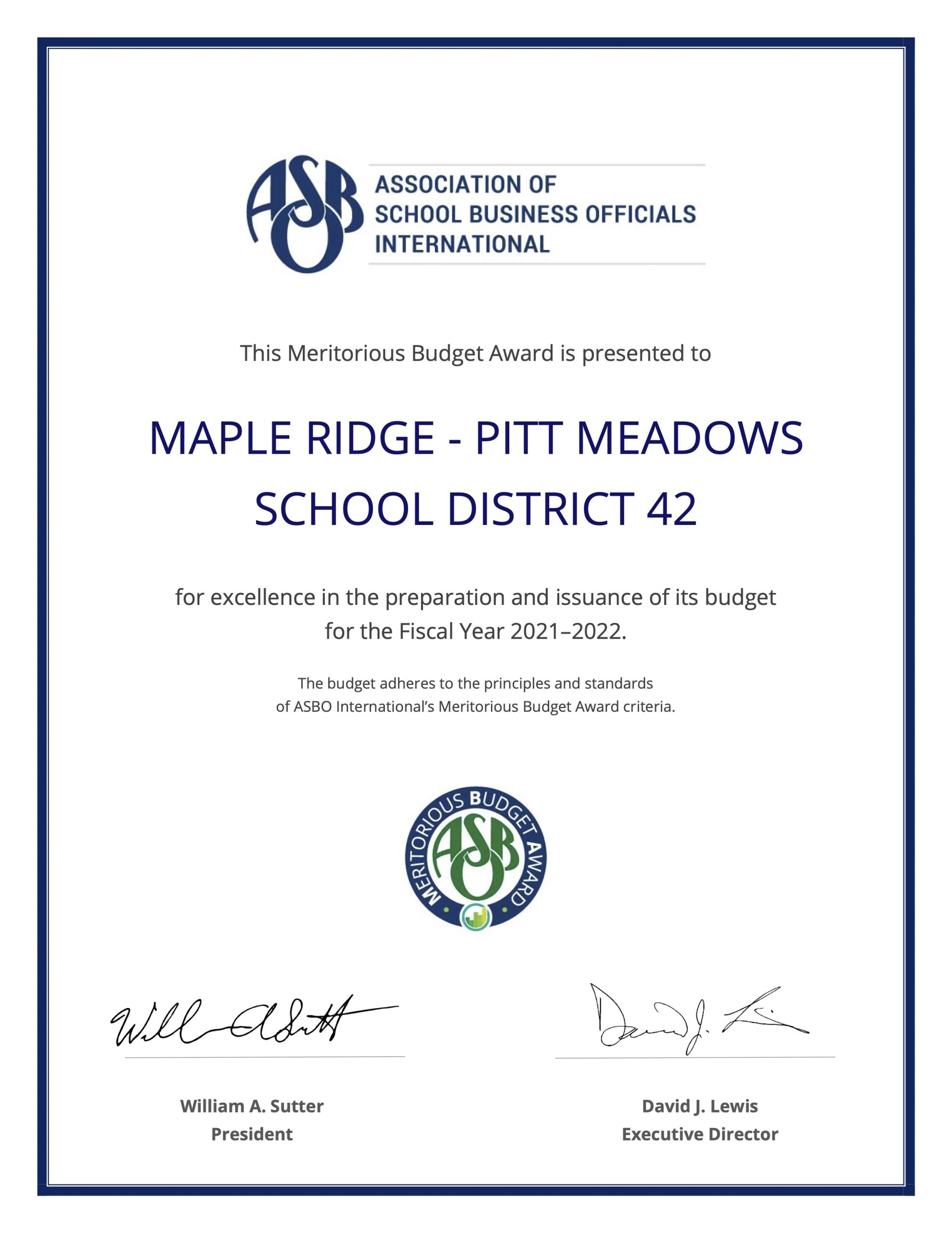The Association of School Business Officials International (ASBO) recognized the Maple Ridge – Pitt Meadows School District for excellence in budget presentation with the Meritorious Budget Award (MBA) for the 2021–2022 budget year.