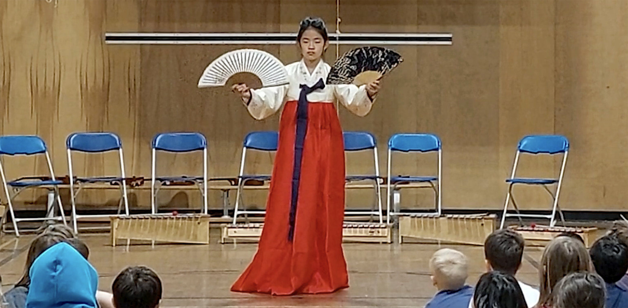 Lia Haeun Kim performed a fan dance at the Highland Park Elementary World Culture Day assembly.
