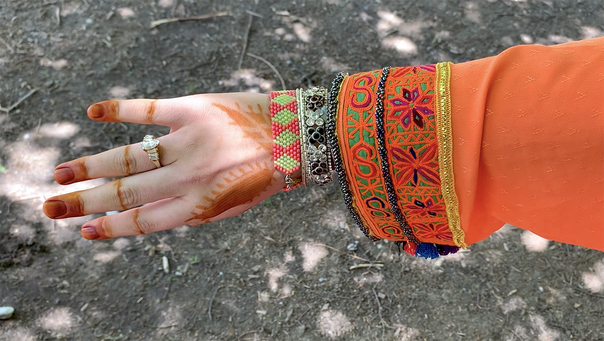 For the event, she wore a traditional orange dress that belonged to her great grandmother, which was adorned in ornate patterns and designs.