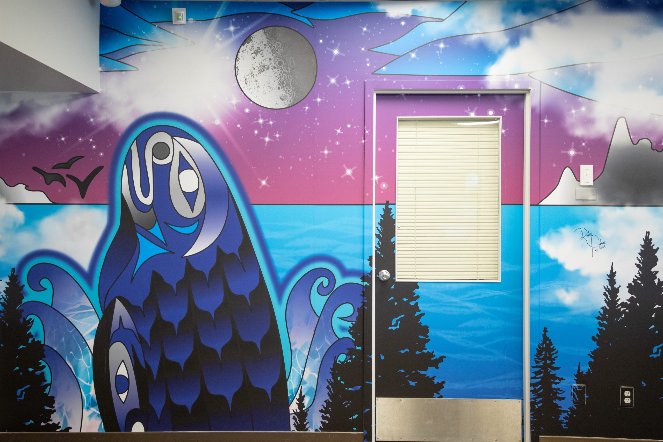 The vibrant blue and purple mural features a salmon breaching the water, with silhouettes of mountains, birds and trees set against a night sky with a glowing moon and stars.
