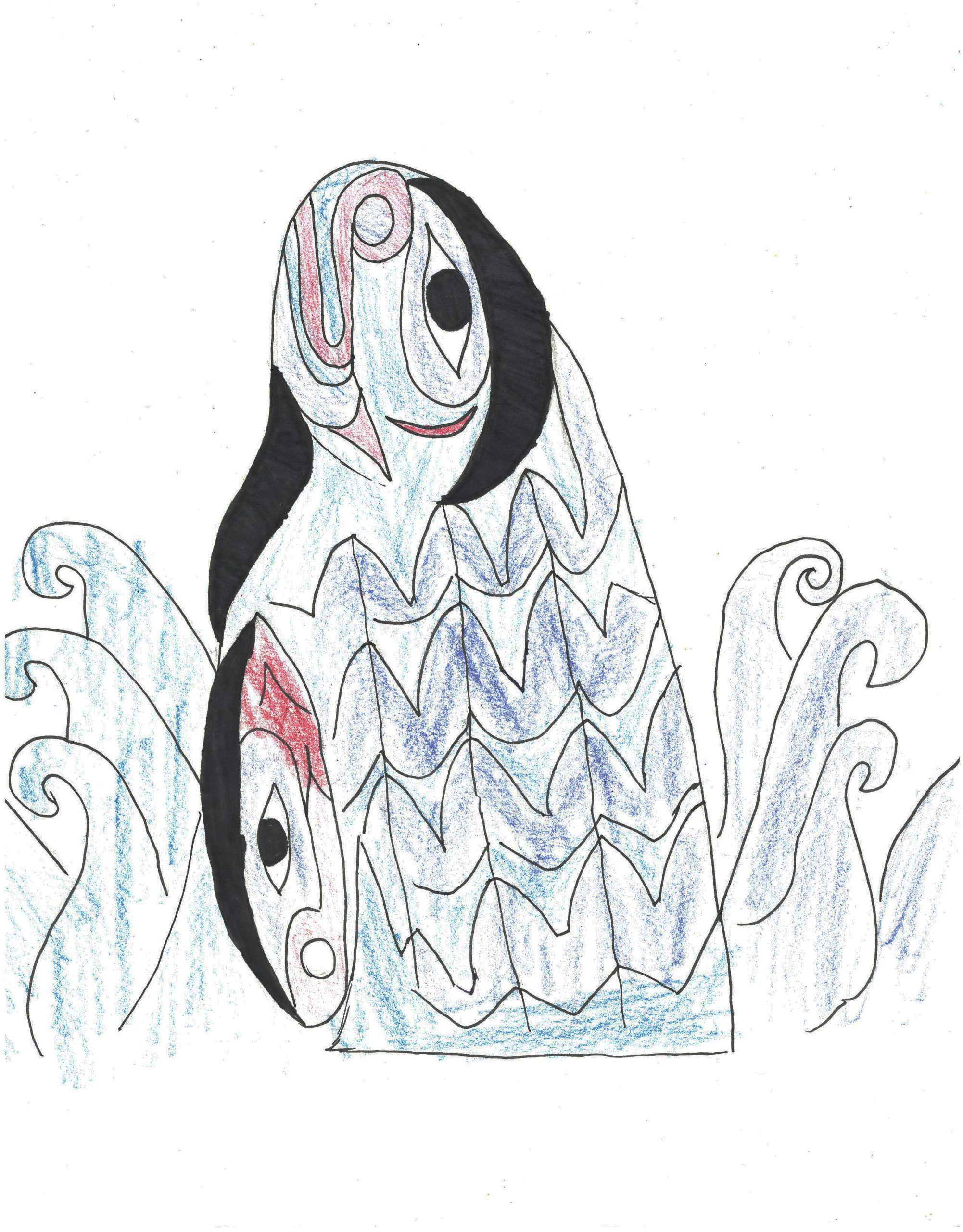 The entire school participated in an art contest, with each class selecting one piece of artwork to submit to Pierre. He reviewed all the submissions and chose two to incorporate in the design: Salmon artwork by Grade 6 student Emily L., and a landscape drawing by Isabelle B., who is in Grade 8.