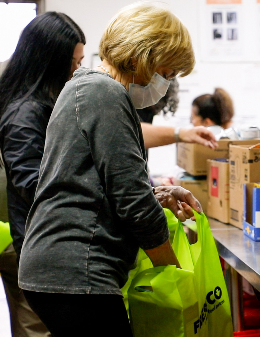 Inside a small room in the Friends in Need Food Bank, there are a dozen volunteers, chatting and laughing while filling up green reusable shopping bags with grocery items.