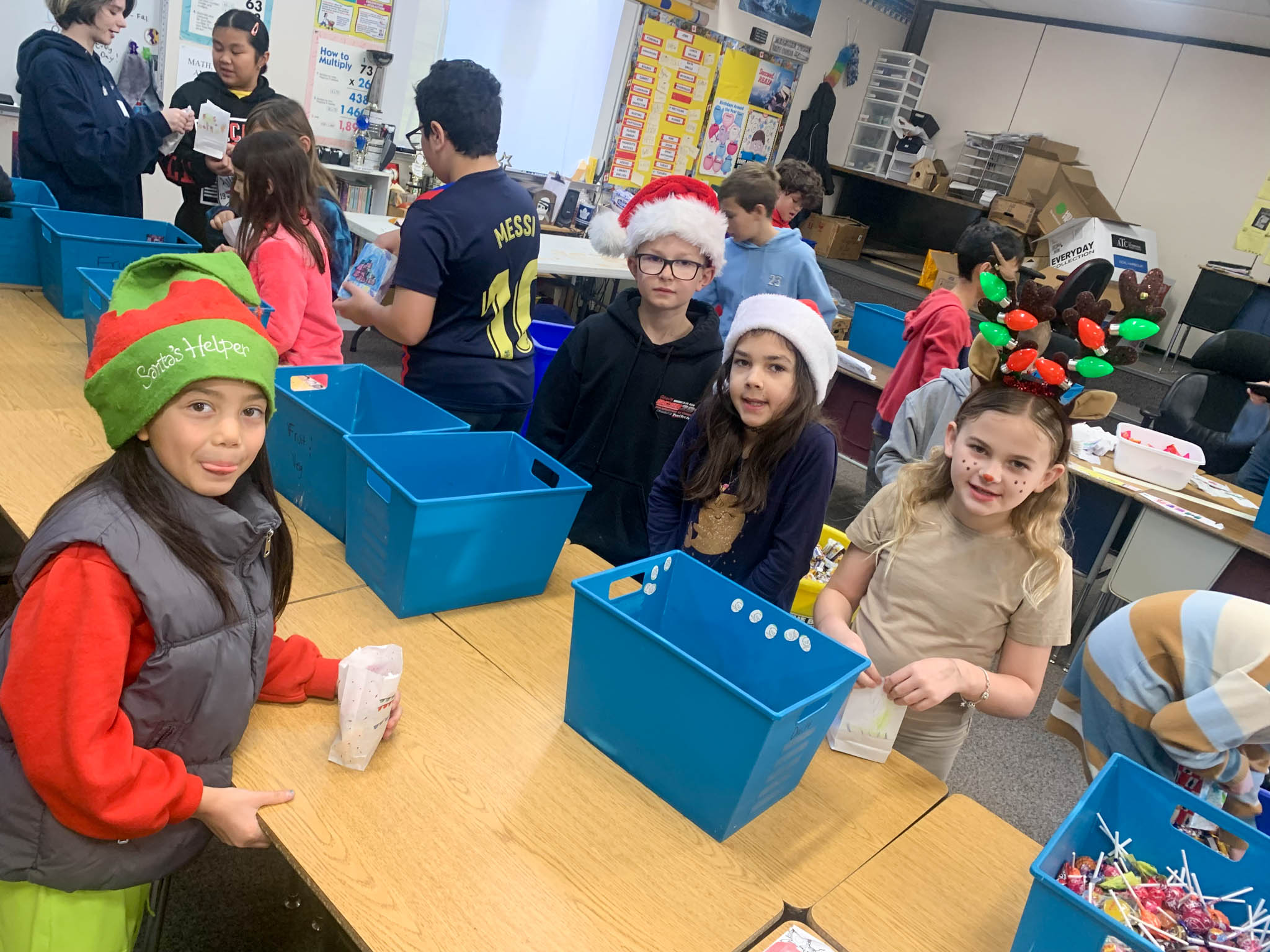 Then, during the last week of classes, teachers Debby and Paul Moran transform their classrooms into a scene that resembles Santa’s workshop, as students get to work stuffing the Christmas bags full of candy, ready for delivery.