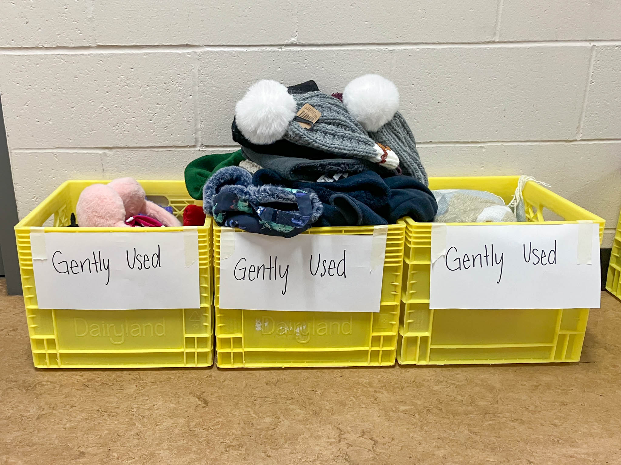 - Crates full of gently used toques, gloves and scarves for donation at Davie Jones Elementary.