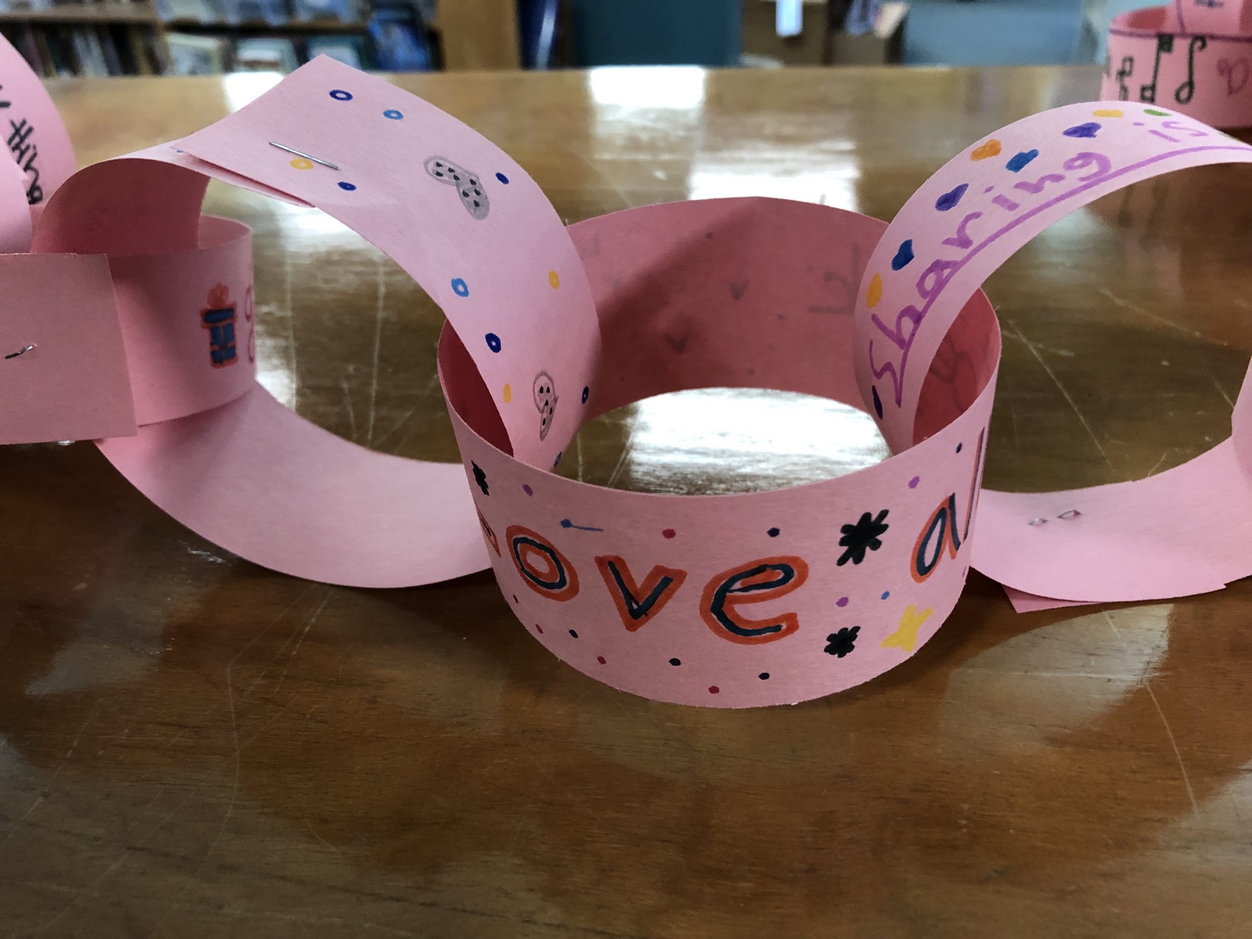 At Yennadon Elementary, Pink Shirt Day is part of the February-long Kindness Month. To kick things off, students were given a strip of paper where they could write or draw a message of kindness along with their name. Teachers stapled the slips together into a giant chain, which has been displayed in the school library.