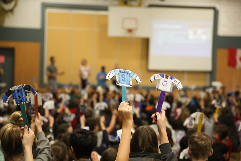 “We had an assembly already planned but honouring Patrice was a surprise twist. At the start of our assembly, we took ten minutes to recognize his outstanding accomplishment. Each student had their own self-decorated mini Tremblay jersey on a popsicle stick hidden beside them. When we surprised him and called him up for the ceremony we all ‘raised his jersey’ and honoured Patrice.”