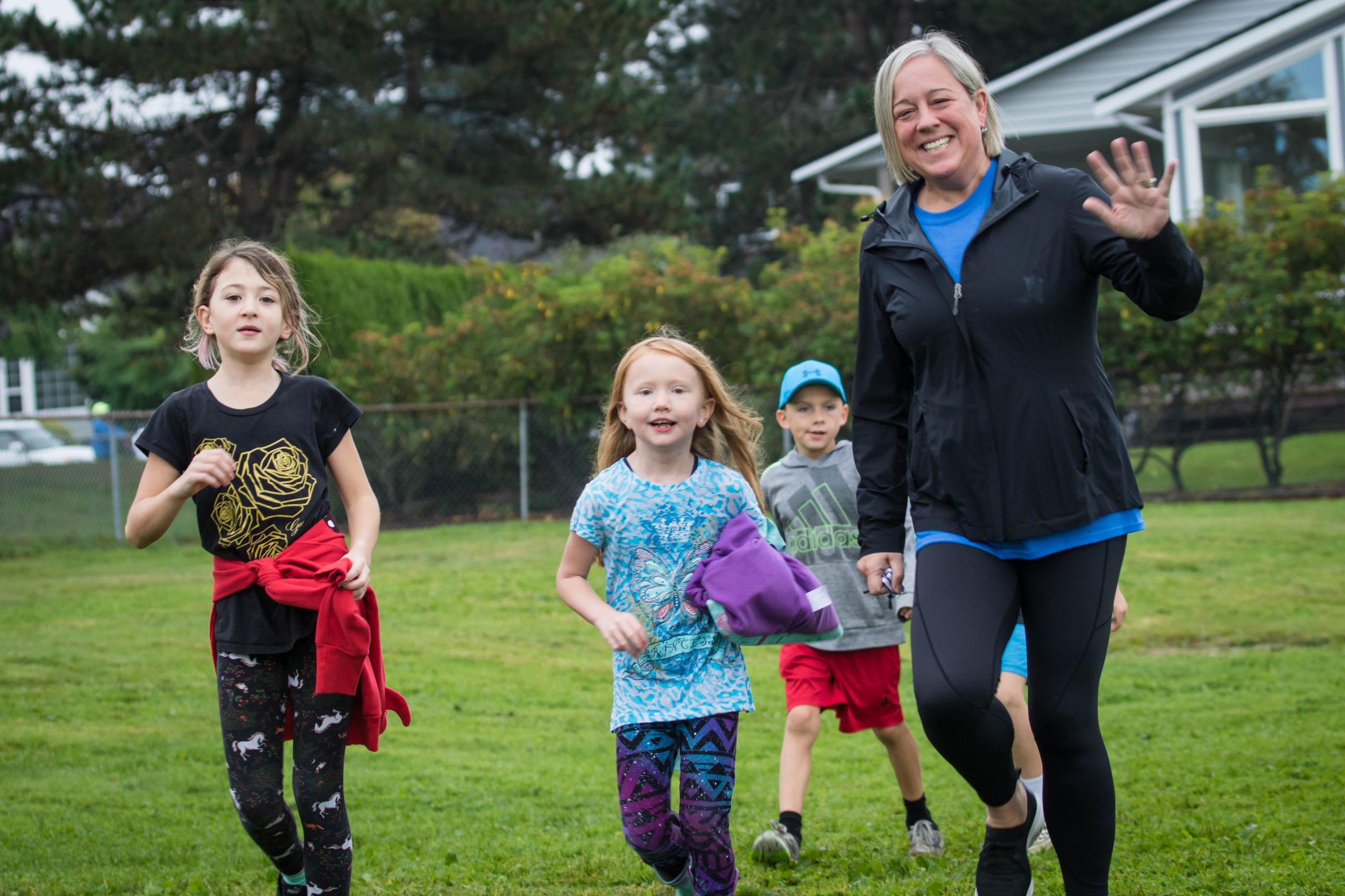 Laity View Elementary principal Kristi Blakeway runs with students during the Terry Fox School Run.