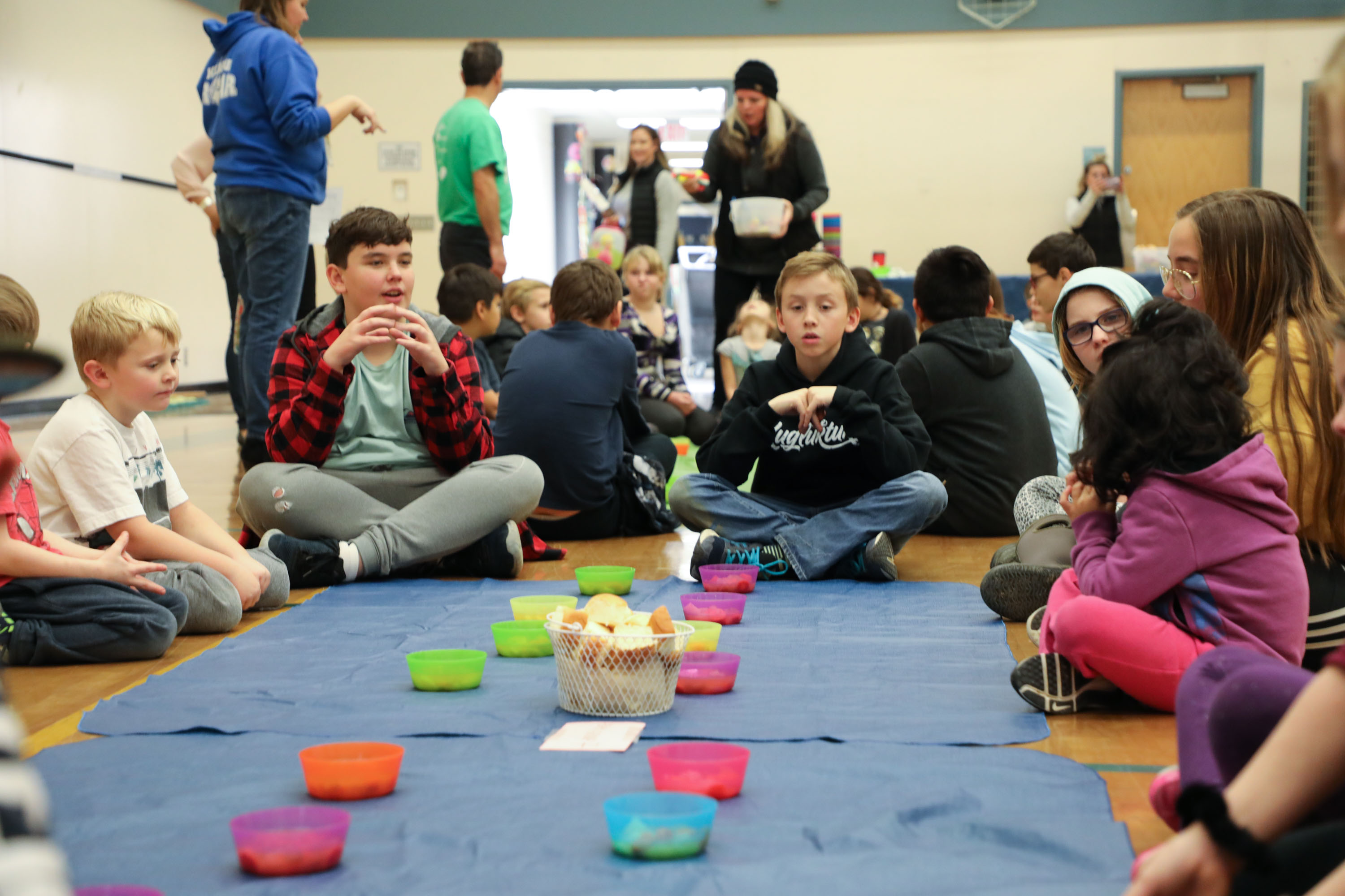 The entire school community gathered inside the gymnasium and sat down to share the meal together.