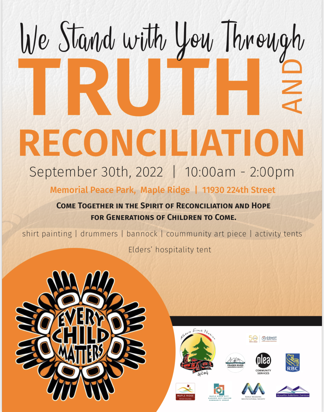 - Come together in the spirit of reconciliation and hope for generations of children to come. The event will include shirt painting, drummers, bannock, community art pieces, activity tents, and an Elders’ hospitality ten.