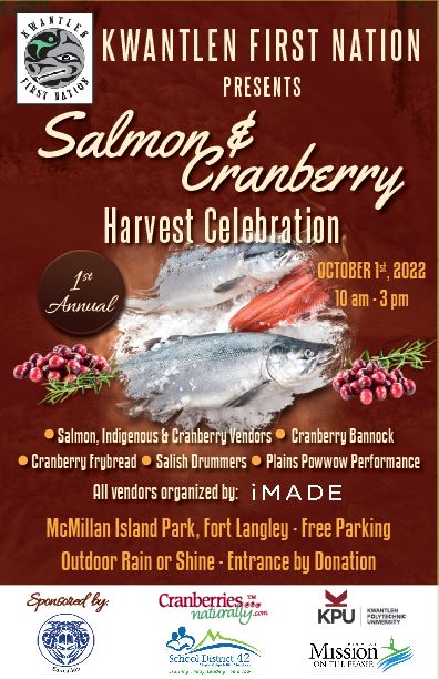 - Kwantlen First Nation presents the first annual Salmon and Cranberry Harvest Celebration. The event will include vendors, cranberry bannock, cranberry frybread, and Salish drummers. Entrance is by donation and the celebrations will take place outdoors rain or shine.
