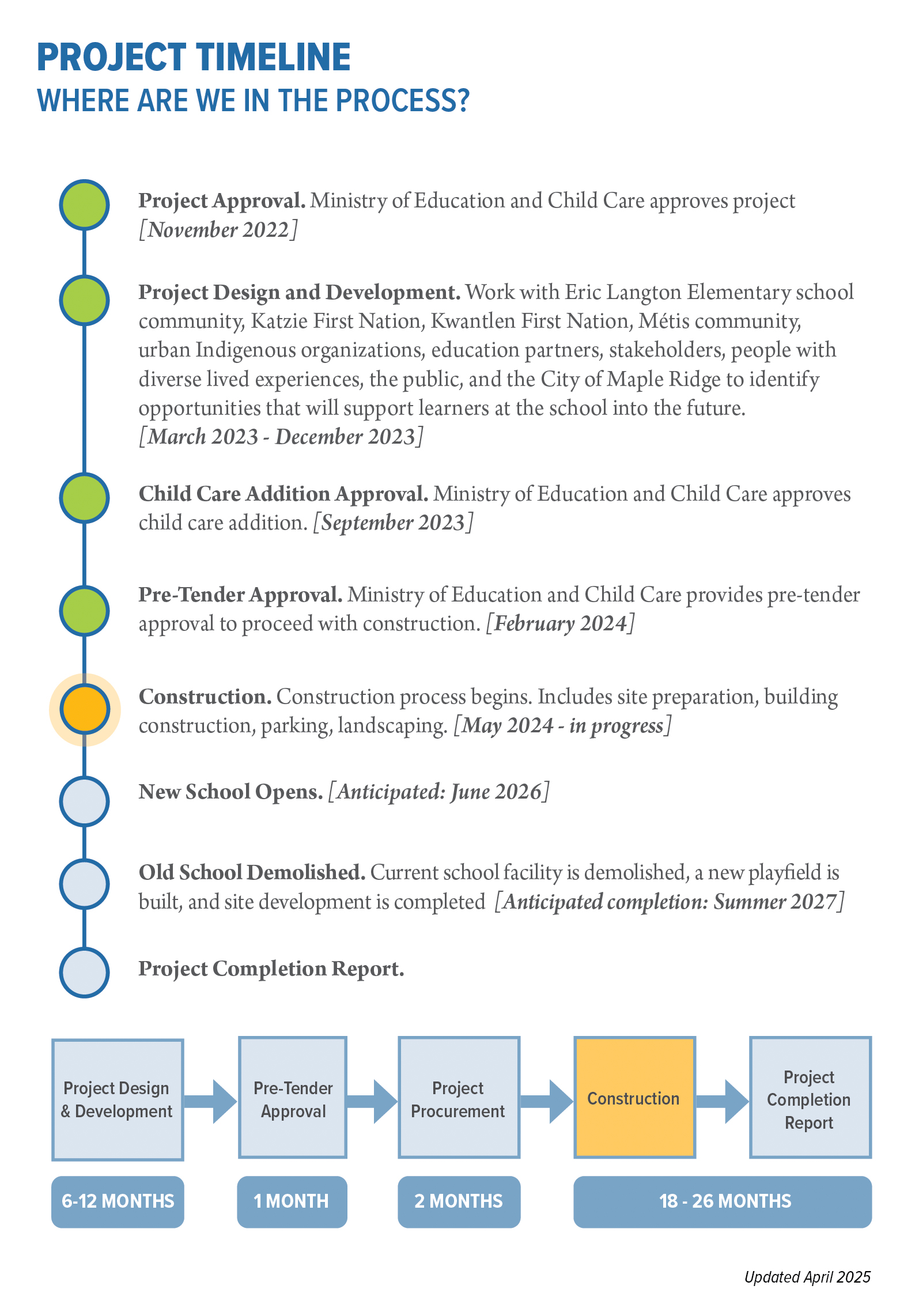 The project timeline below was updated April 2025, and reflects that we are in the construction phase. The project was tendered to pre-qualified general contractors on February 20, 2024, and bids were received on April 8, 2024.