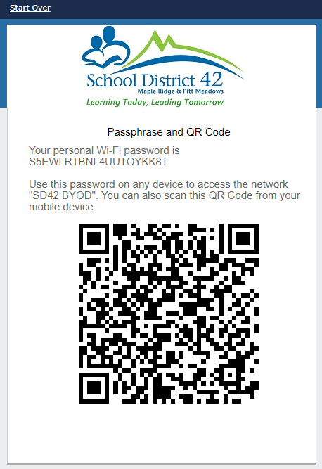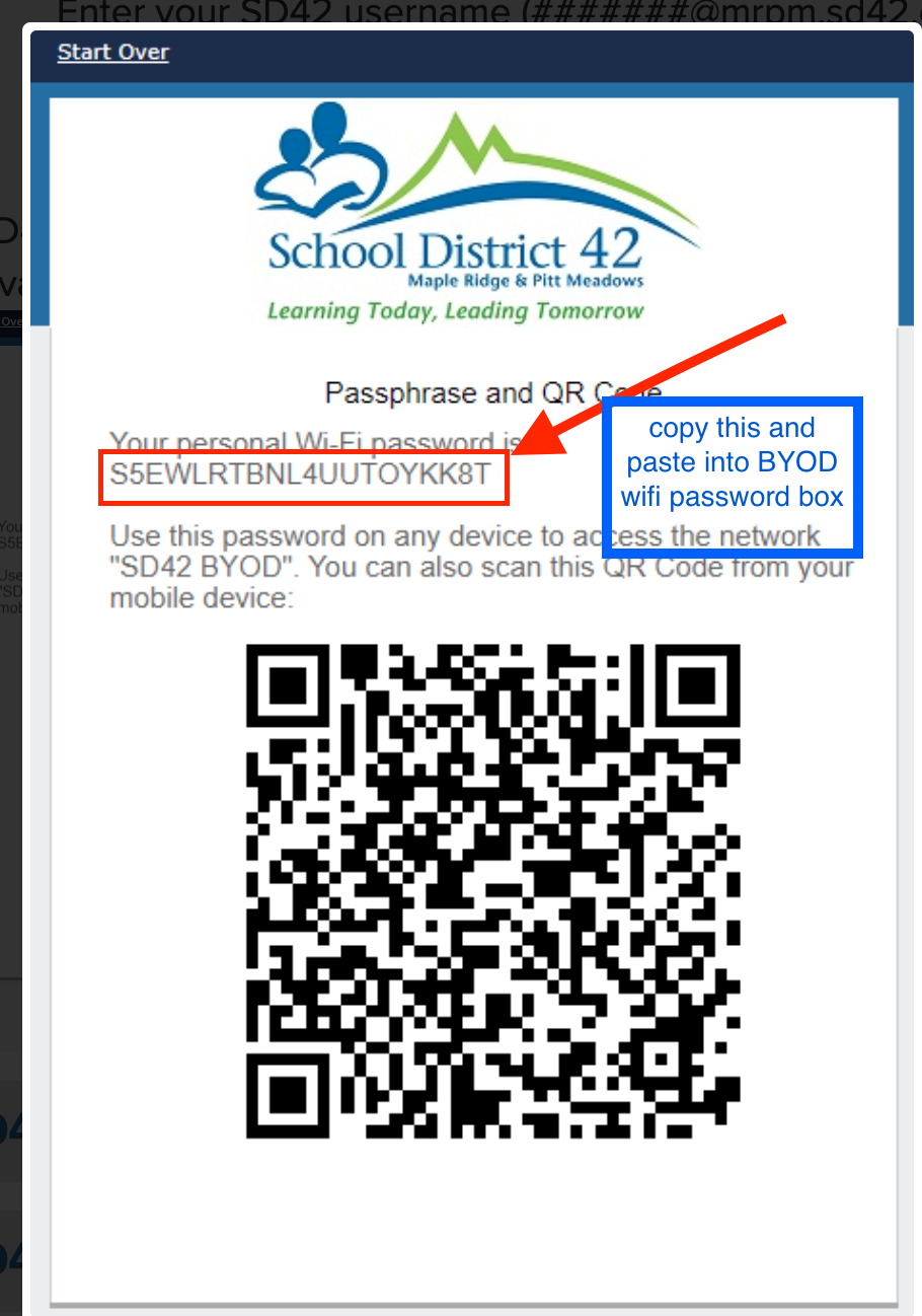 7. You should then receive a personal Wi-Fi password. Use this password to connect to the “SD42 BYOD” network through your device’s wireless menu. It is recommended to take advantage of copy + paste on your device to copy the password into the password field.