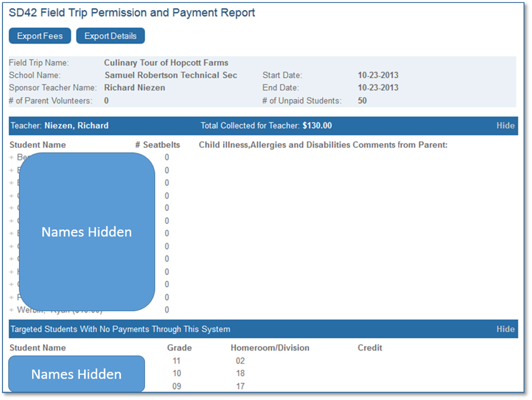 • List of students that have submitted forms, and payments if applicable (by clicking the + symbol next to the student name, you can see the information submitted for the student)