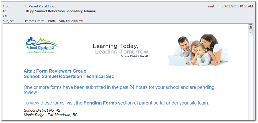 - Once every 24 hours, a process on the parent portal scans each school’s Pending Forms queue for outstanding form submissions. If found, an email notification is sent to that school’s administrators (Figure 2)