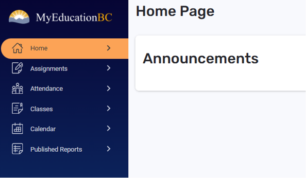 From here, you can easily access key information by clicking the items in the left menu bar: Assignments (including due dates), Attendance (daily and class), Classes, Calendar (upcoming course events/tasks), and Published Reports (report cards/learning updates).