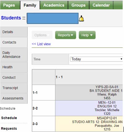 Schedule provides information on your secondary student’s timetable. You can look at today’s schedule, the semester schedule, or the whole year, just by switching the drop down at the top of the window. In the spring, you can view course requests that your child has made for the next school year.