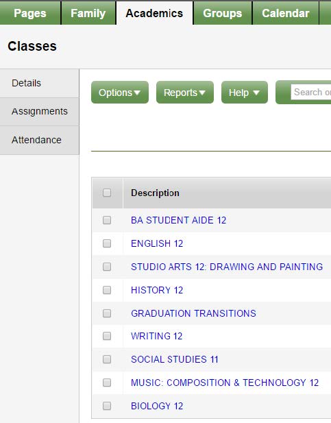 From here, you can easily access key information by clicking the items in the left menu bar: Assignments (including due dates), Attendance (daily and class), Classes, Calendar (upcoming course events/tasks), and Published Reports (report cards/learning updates).