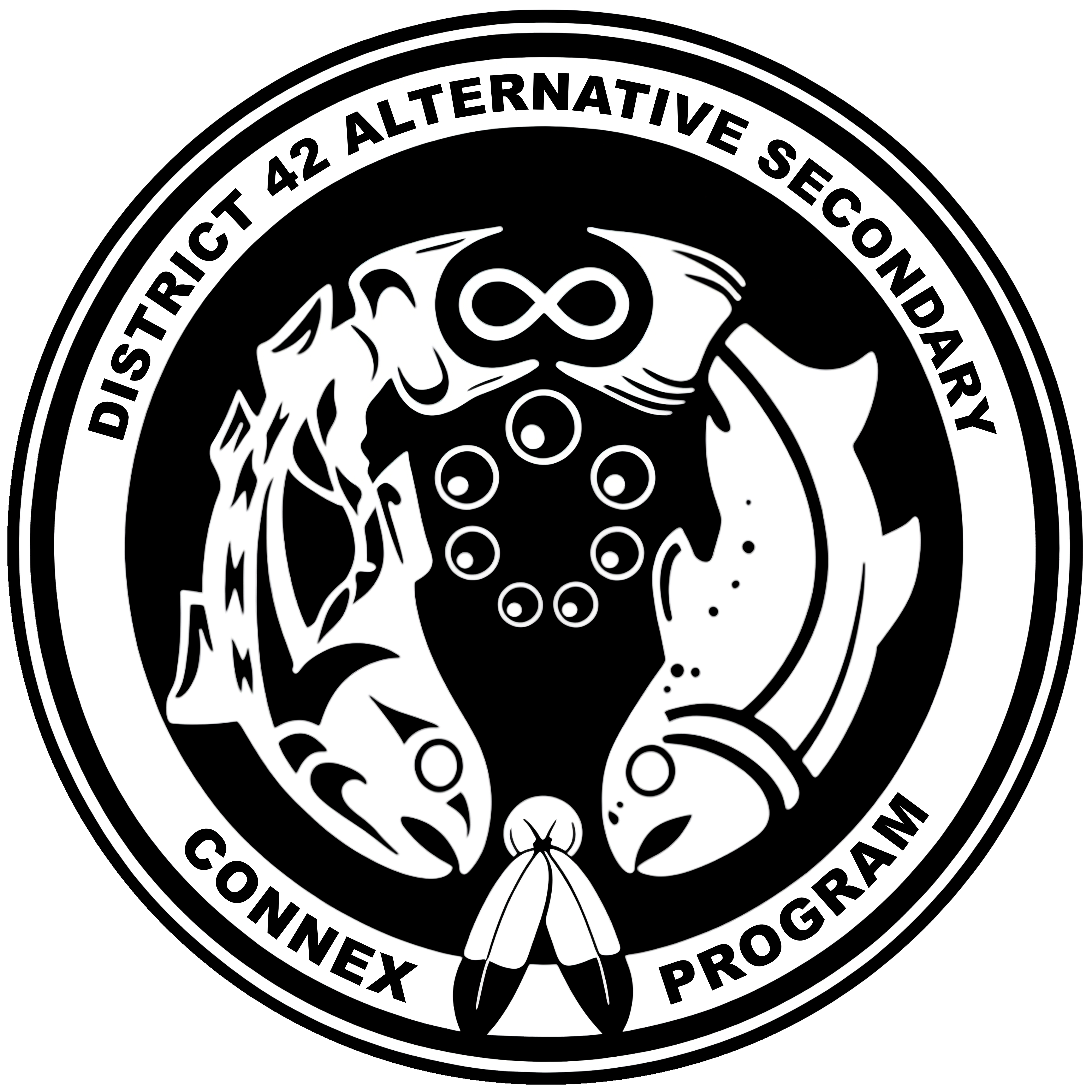 The logo features a pair of salmon: one with a nod to Coast Salish design and the other with a western design. The salmon illustrate Connex’s use of the two-eyed seeing approach in the way it supports its students and critically evaluates the systems within which it operates, specifically the way these systems affect BIPOC (Black, Indigenous and People of Colour) students.